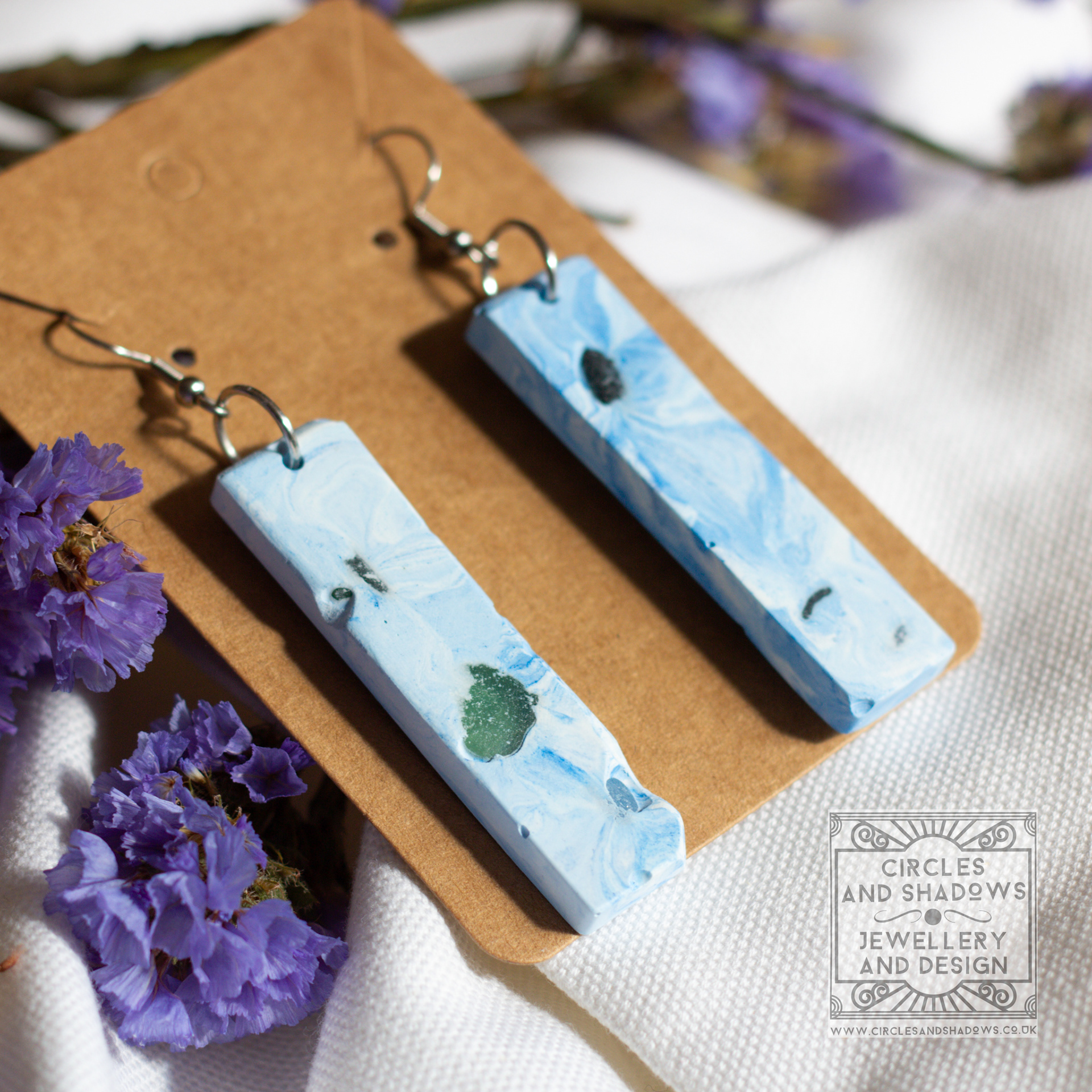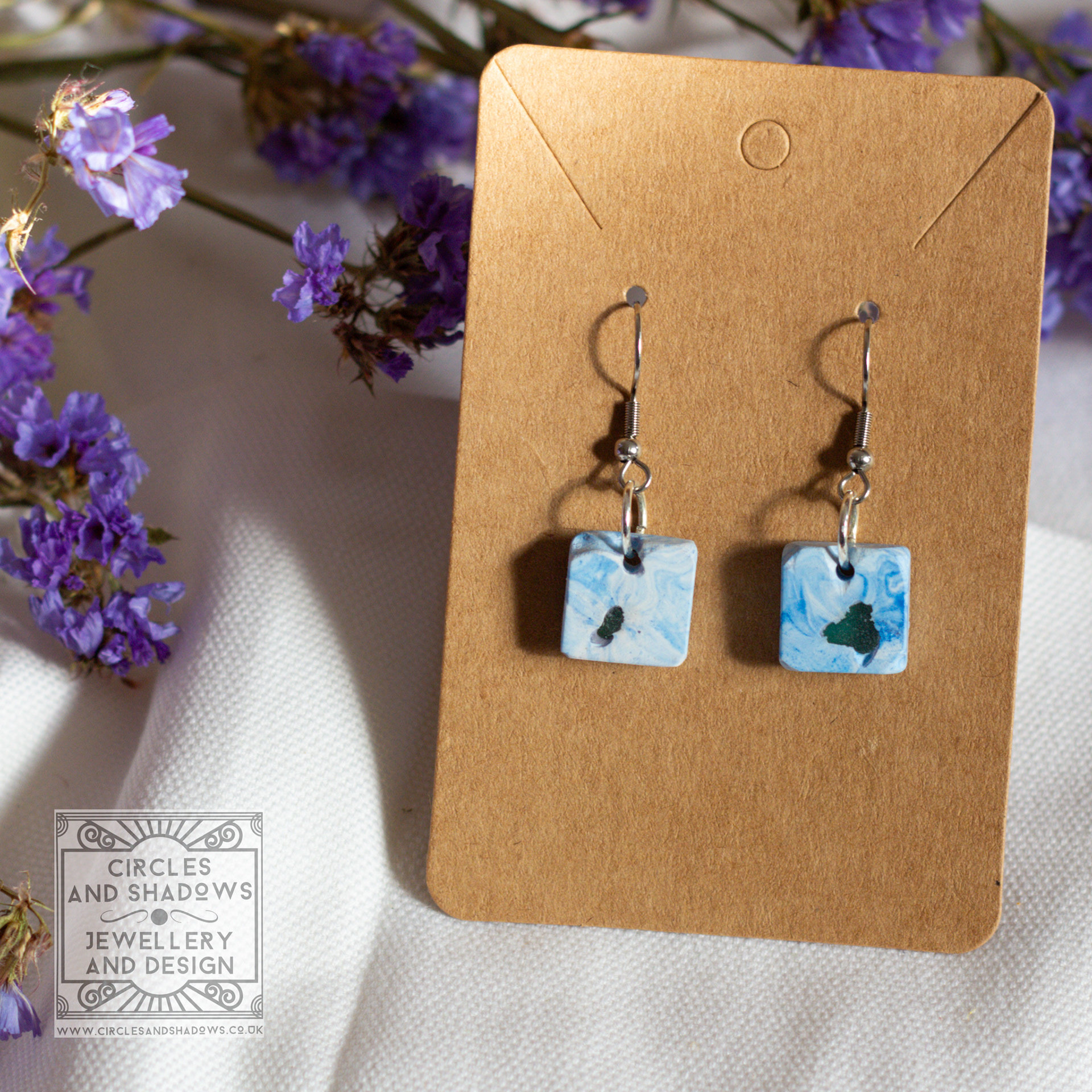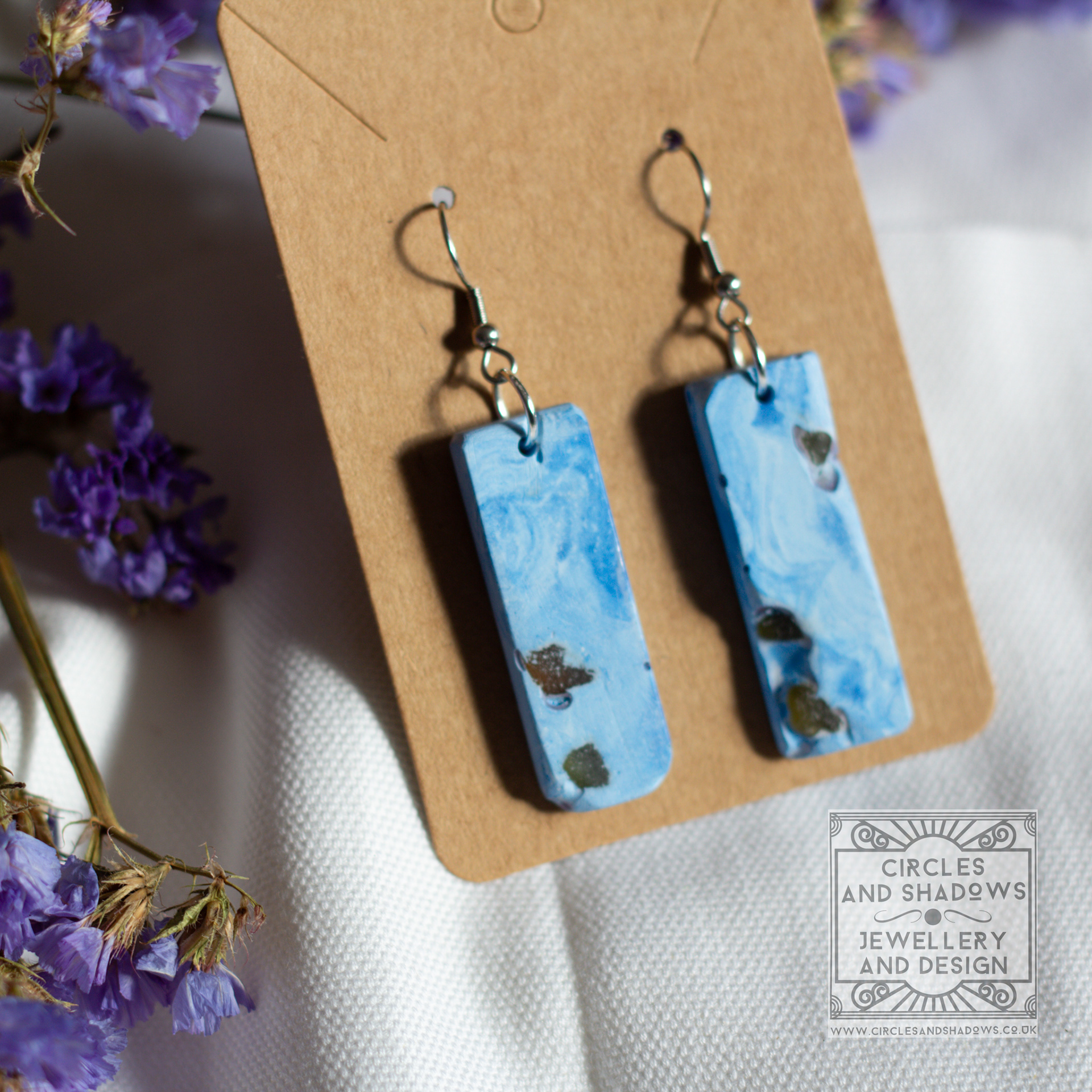 This collection is made from an eco resin. The sea glass pieces are embedded in the resin and then sections are uncovered to create an organic look and feel.